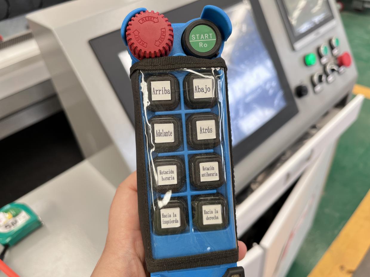 9. El control remoto controla el accionamiento de la máquina para realizar el movimiento y trasladarse en el taller, mediante ruedas motorizadas independientes, permitiéndole girar 360º y moverse horizontal y transversalmente. Esto permite que la máquina puede moverse de un caballete a otro, o ser movida de un sector a otro, optimizando la ocupación en la planta.